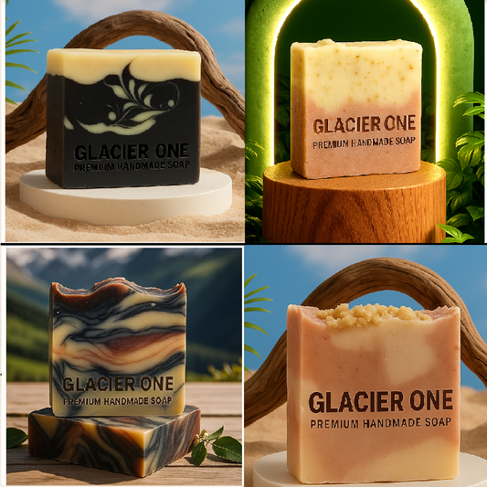 Premium Soap Combo of 4 Pack ( 1 Unit of Coffee-Activated Charcoal Scrub Soap, 1 Unit of Pink Himalayan Salt-Neem Scrub Soap,1 Unit of Glacier touch Soap,1 Unit of Himalayan Honey GlowSoap)